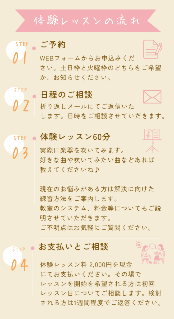 体験レッスンでは現在までのフルート歴(音楽歴)についてや